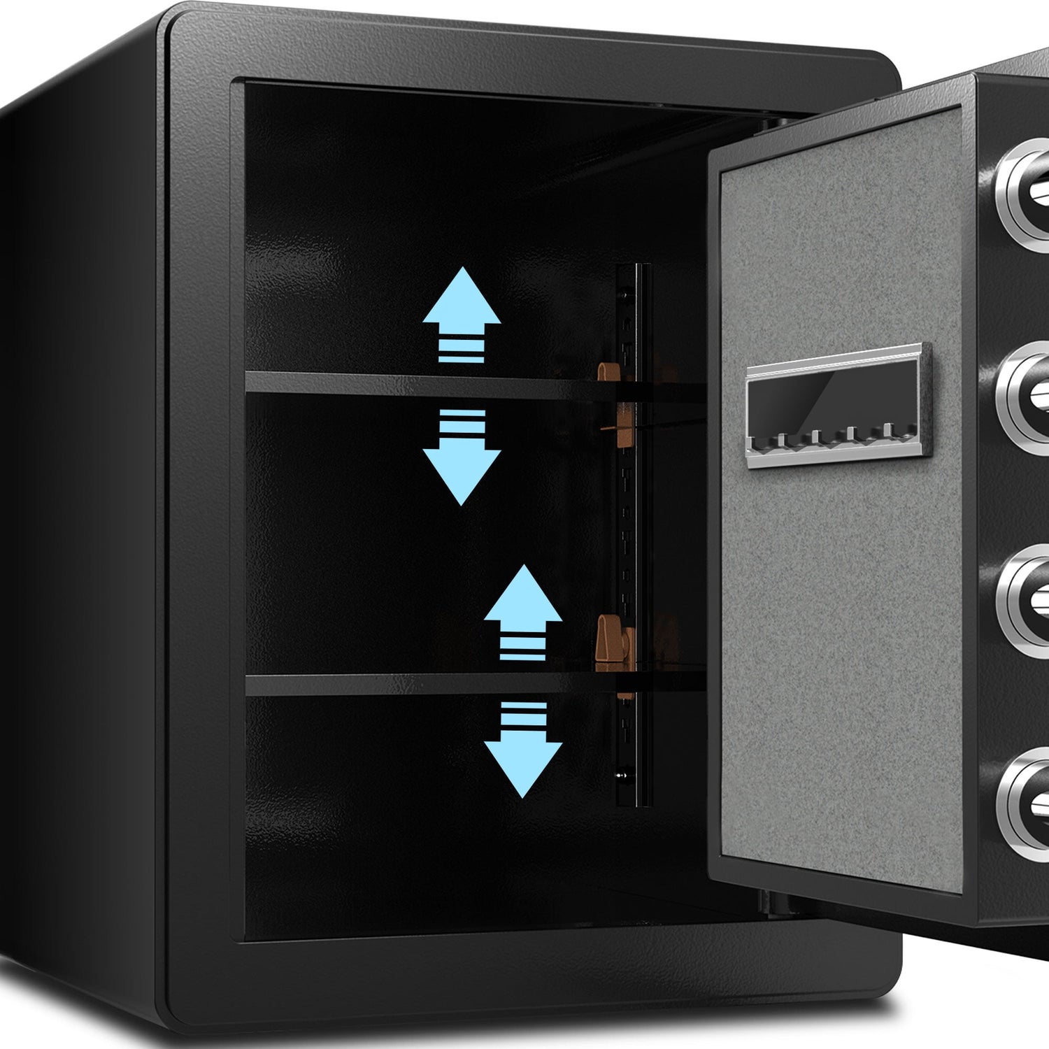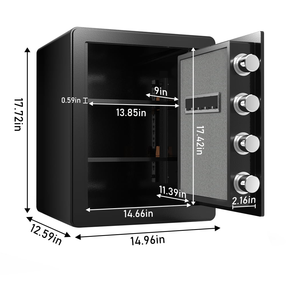 Large Storage Space---1.73 cubic feet space, can be used to store cash, laptops, pistols, jewelry, documents, souvenirs, and other valuables; two removable, adjustable shelves grant you the freedom to adapt to your storage needs.