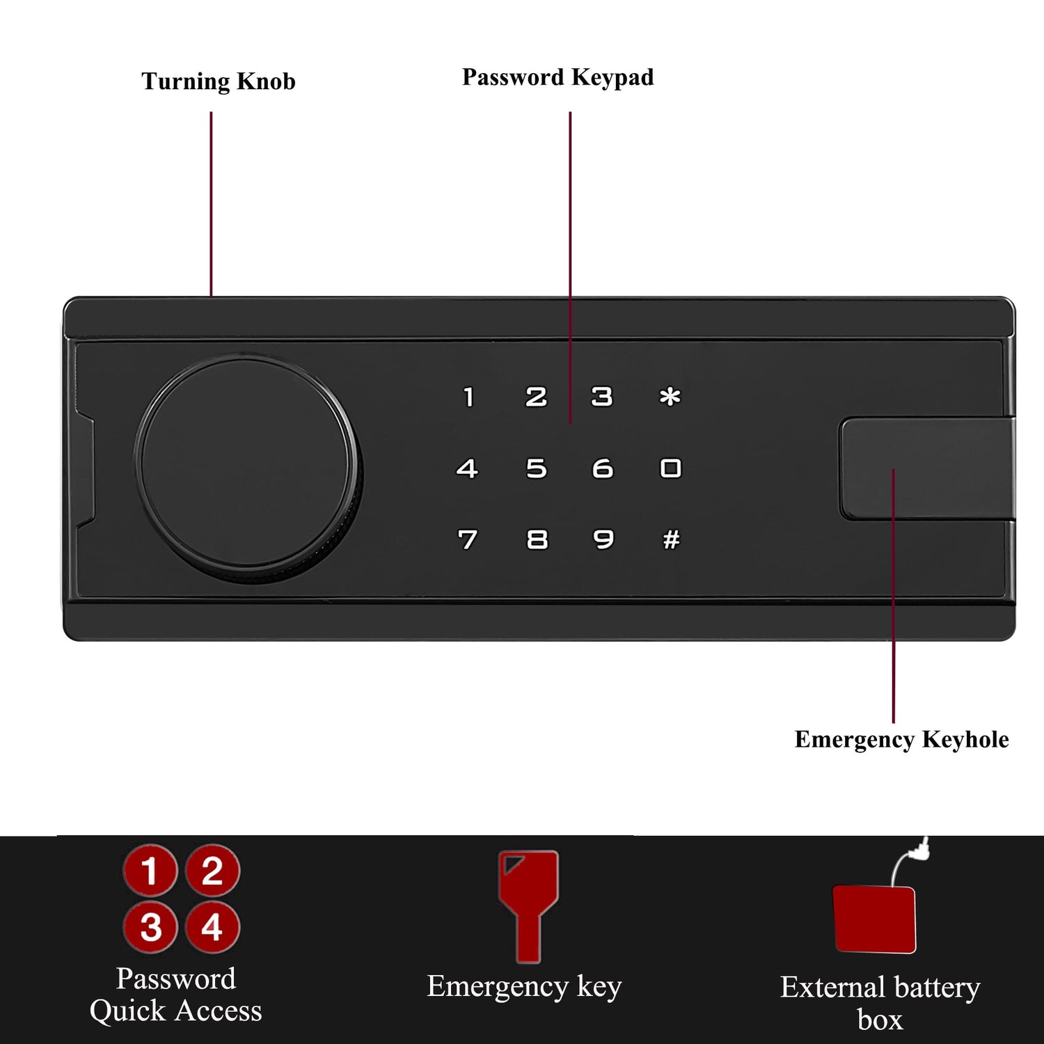 3-ways Open---Password; emergency key; emergency battery box + password.