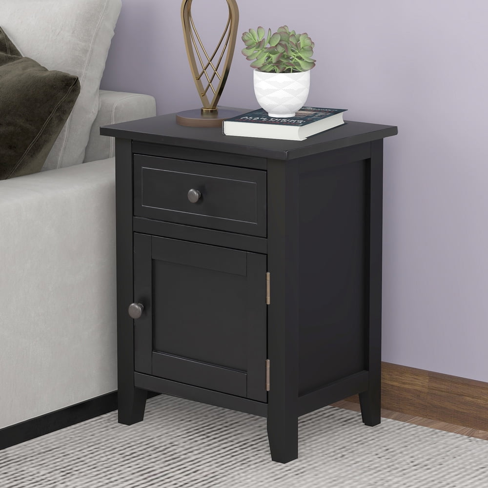 1-Drawer Bedside Table, Sesslife Solid Wood Nigh Stand with 1 Cabinet, Modern Bedroom Nightstand, Living Room End Table, Black