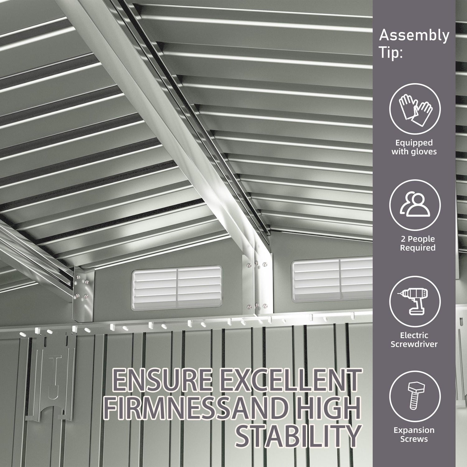 Don't let your patio get cluttered, opt for the SESSLIFE Outdoor Storage Shed. With a sizeable 10' x 8' footprint, it's perfect for storing a variety of tools and gardening supplies. Crafted from upgraded galvanized steel, it offers robustness and longevity. Its superior weather resistance and water resistance provide optimal protection!