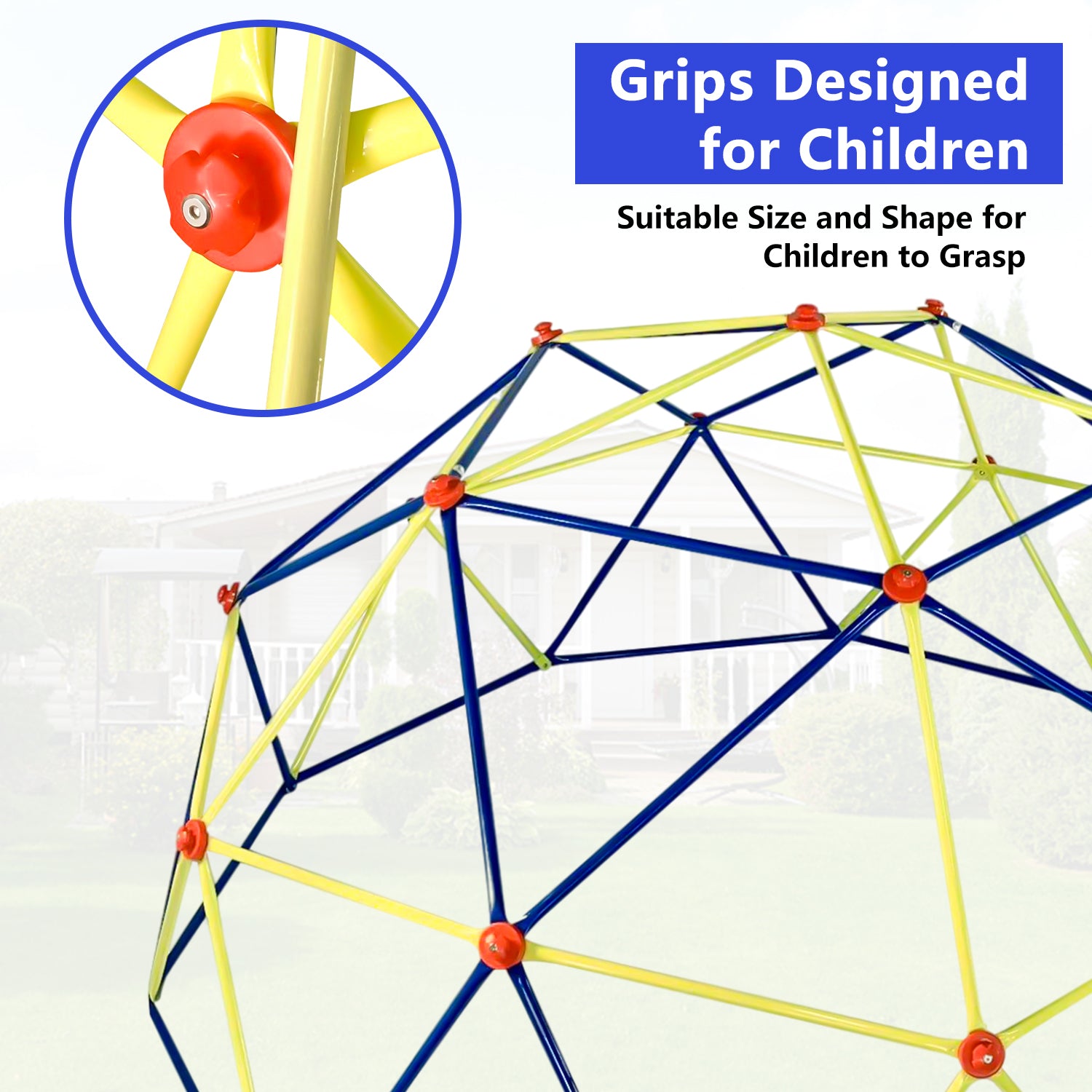 This kid climbing dome has a hemispherical design and is composed of many triangles, a combination of bright blue and yellow, plus cute frog-shaped climbing handle, which is definitely a favorite style for children.