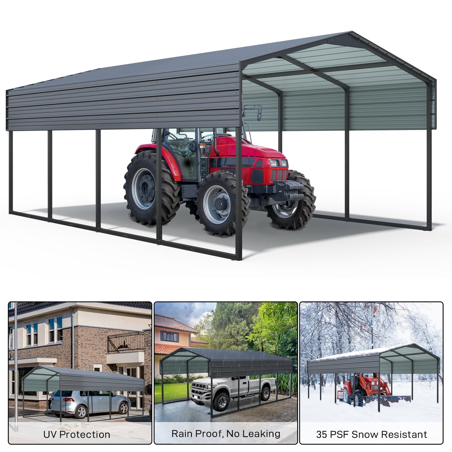 🏘️Weather-Resistant Material---The high-strength galvanized steel roof offers exceptional rust and sun protection. This weather-resistant material makes it ideal for outdoor use, safeguarding your belongings from harsh elements such as rain, snow, and UV rays. The carport can withstand wind speeds of up to 100 MPH and can bear a snow load of 35 PSF.