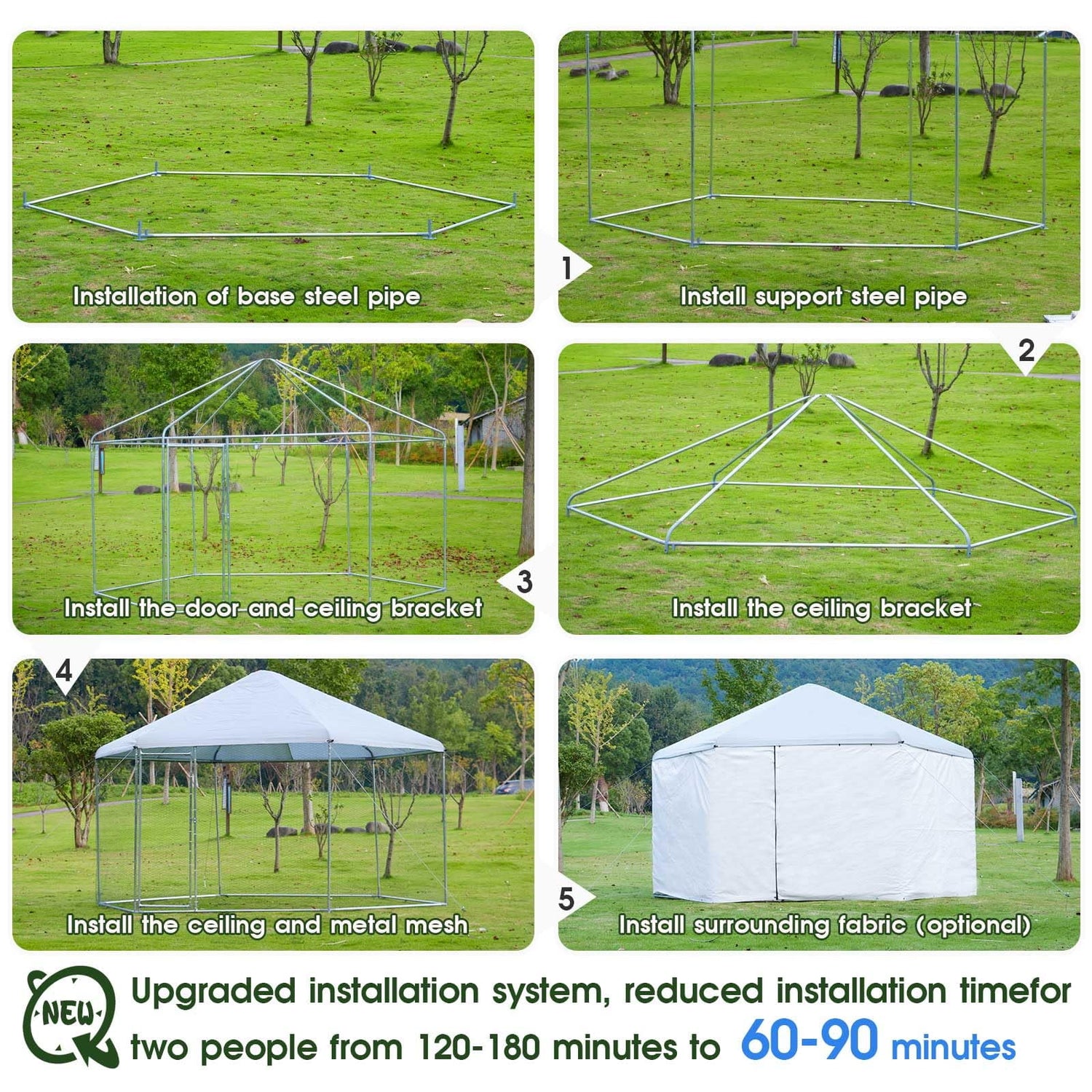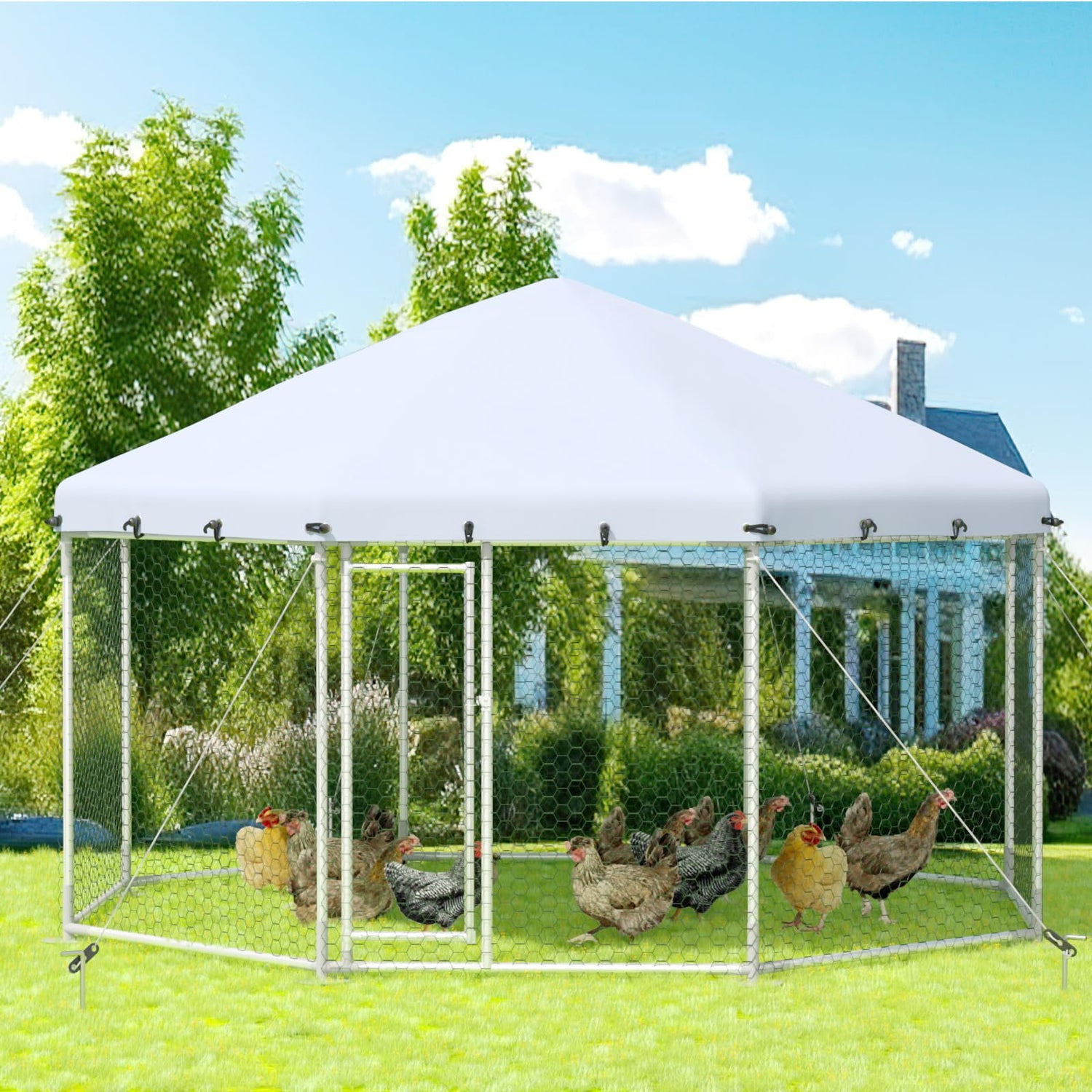 Durable & Strong--Supported by thick galvanized steel pipes and PVC-coated wire, this chicken coop is strong enough to withstand long-term outdoor use, ensuring the chickens are safe from predators. The hexagonal shape has better overall stability, top is connected by multiple support rods, and each corner is reinforced with ropes, making the product more stable.