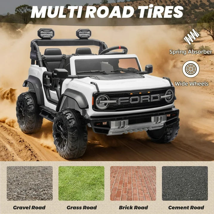 The Ford Bronco Raptor 24V 2 Seater Ride-On Car is perfect for Christmas, birthdays, New Year, and Children’s Day. Watch their eyes light up joyfully as they embark on countless adventures with this incredible ride-on car. This officially licensed Ford Bronco Raptor electric car for children has a realistic and stylish product appearance, and truly replicates the LED headlights of the Bronco, making this 2 Seater ride on cars the best partner for your child's outdoor adventures. This 2 Seater ride on toy is equipped with a large-capacity 24V7AH battery and a super-powerful 90W click with a maximum speed of 4.37 MPH, allowing children to enjoy the joy of ride on. For the safety of young drivers, we use 4 4-tire spring shock absorption system, wear-resistant and non-slip tires, seat belts, parental remote control, safe slow start, and other functional details to ensure stable riding no matter how uneven the wheel surface is. This oversized ride on car is equipped with 2 extra wide seats that can accommodate 2 children aged 3 or 1 child under 8 at the same time, with a maximum load capacity of 132lbs. We have thoughtfully added a high-quality car music player, which you can play via Bluetooth, USB, and radio. Come and experience the joy brought by this two seater ride on car.