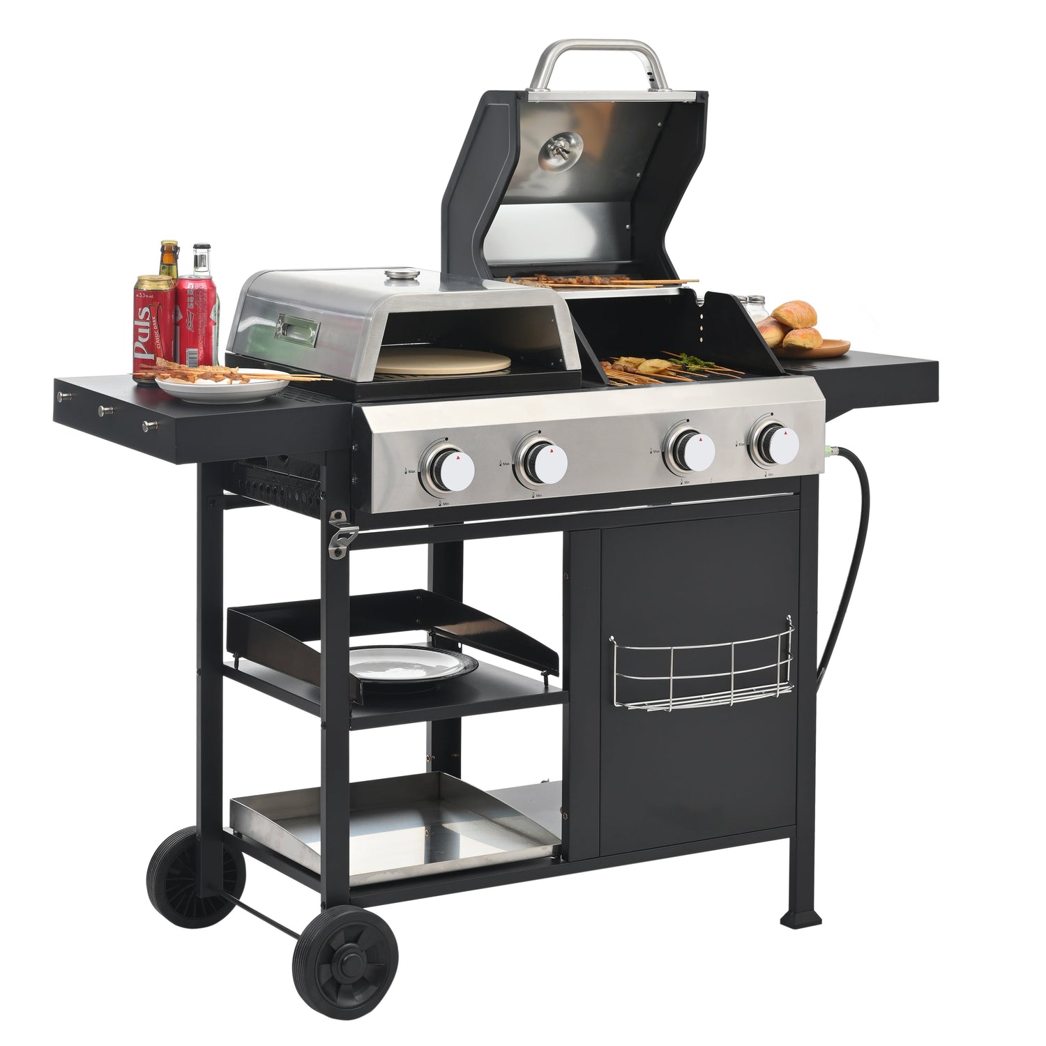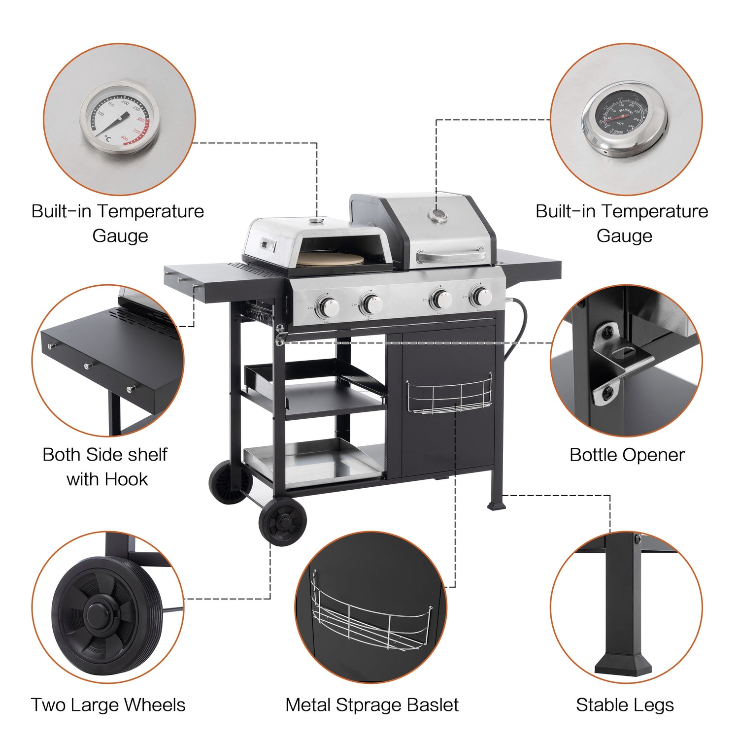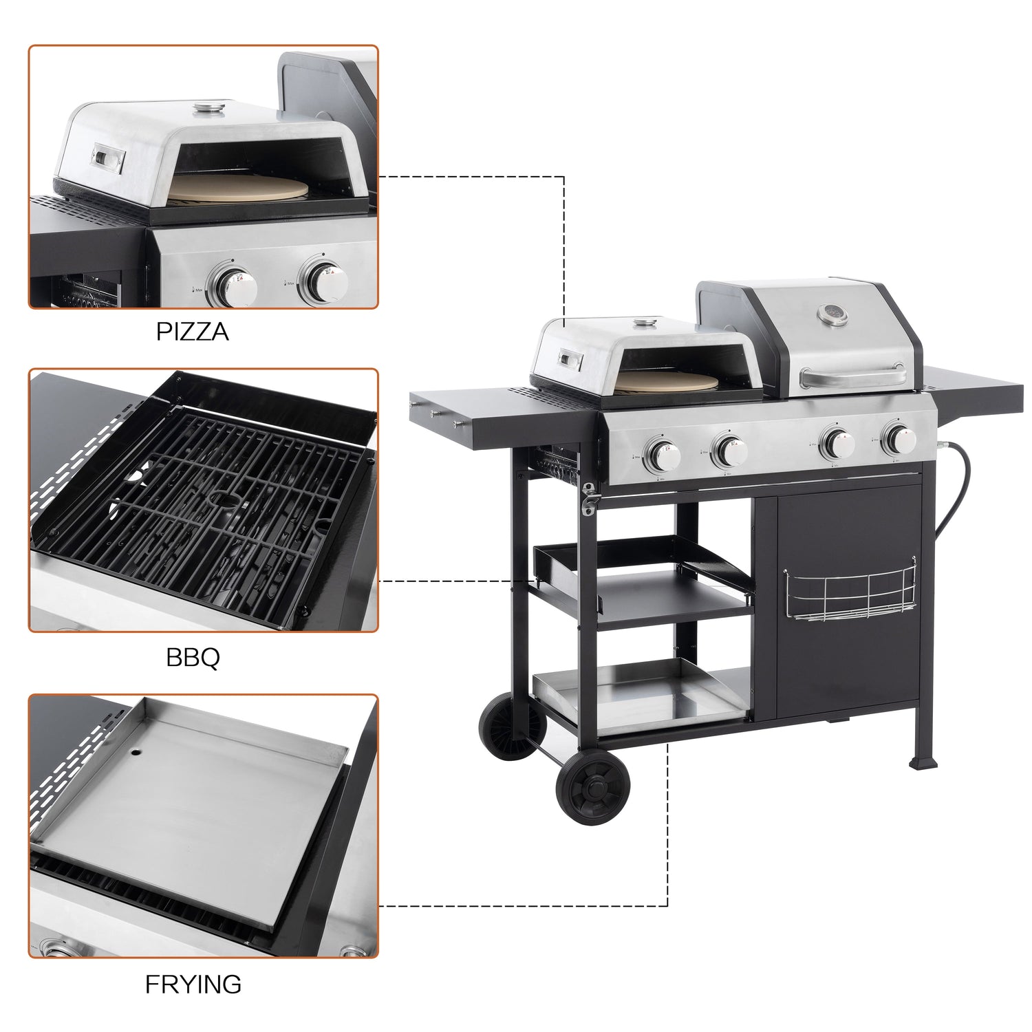 How wonderful it is to have a barbecue with friends or family on the weekend! This multifunctional gas grill is crafted from upgraded cast iron and stainless steel, ensuring durability and high-temperature resistance. It comes equipped with grill grates, frying pans, and pizza pans to satisfy all your culinary needs. With ample side and bottom storage, this grill offers unmatched convenience. Don't hesitate—give it a try!