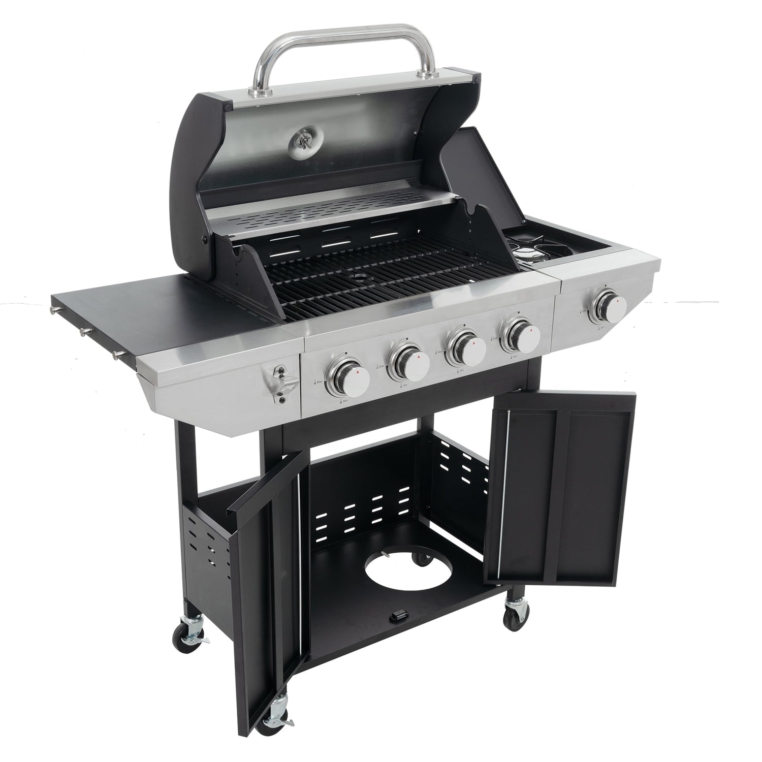 Propane gas grill is more environmentally friendly with a built-in stainless steel thermometer; burners are individually controlled by 4 switch knobs for a total of 46,700 BTU output, including 38,200 BTU for the main cooking area and 8,500 BTU for the side burner.
