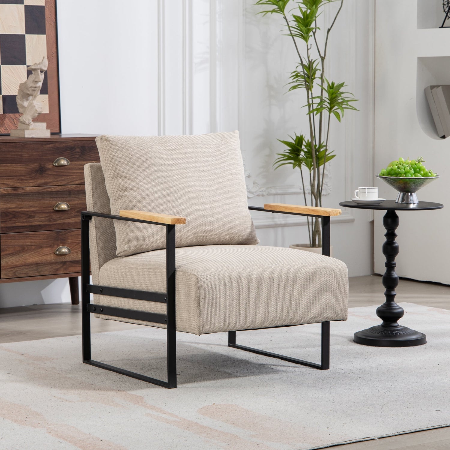Accent Chair, Modern Arm Chair Leather Upholstered Reading Accent Chair with Metal Frame Solid Wood Arm for Living Room Bedroom Sunroom, Khaki.