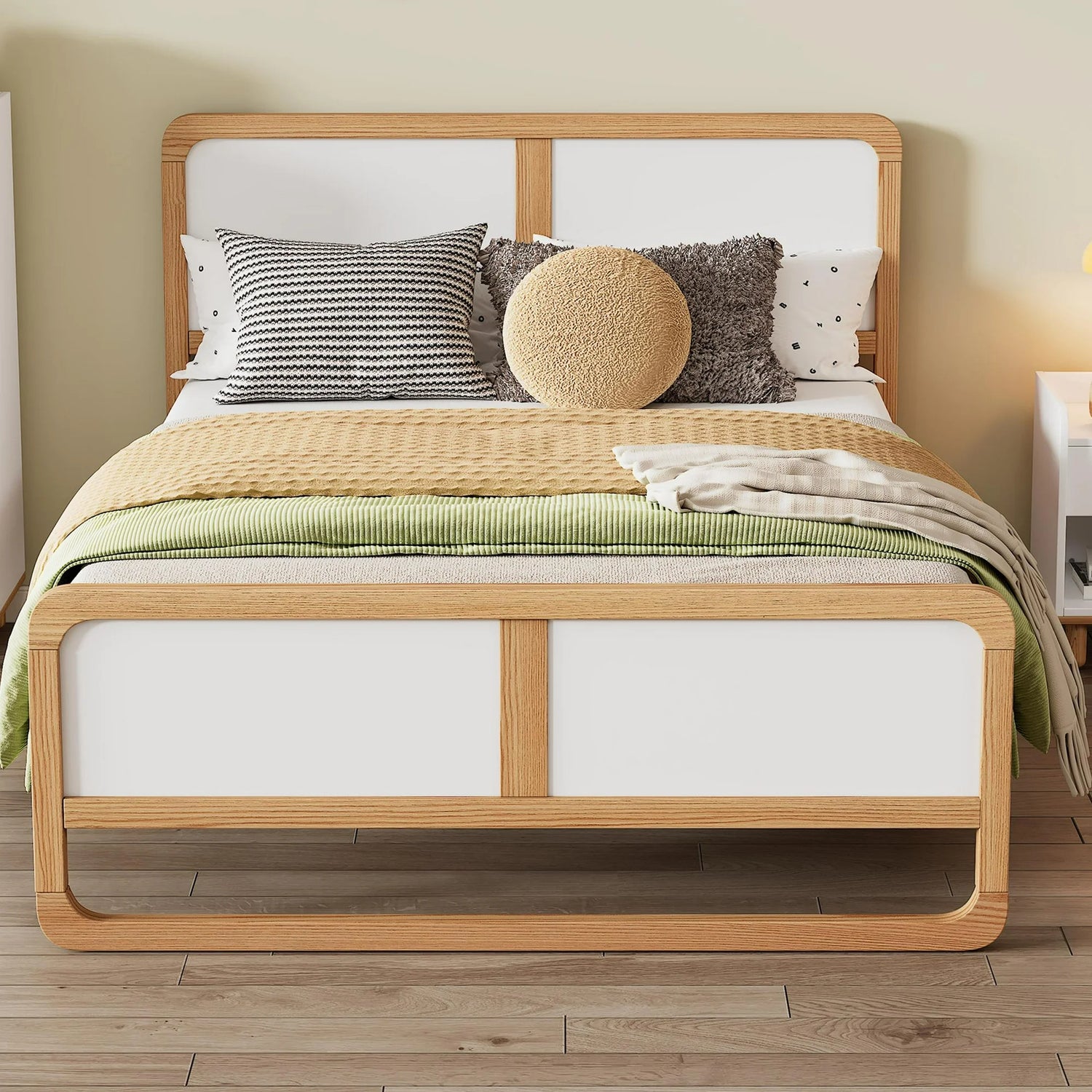 ENYOPRO Twin Wood Platform Bed, Modern Twin Bed Frame with Headboard and Footboard, No Need Box Spring, Strong Wood Slat Support, Easy Assembly, Walnut and White