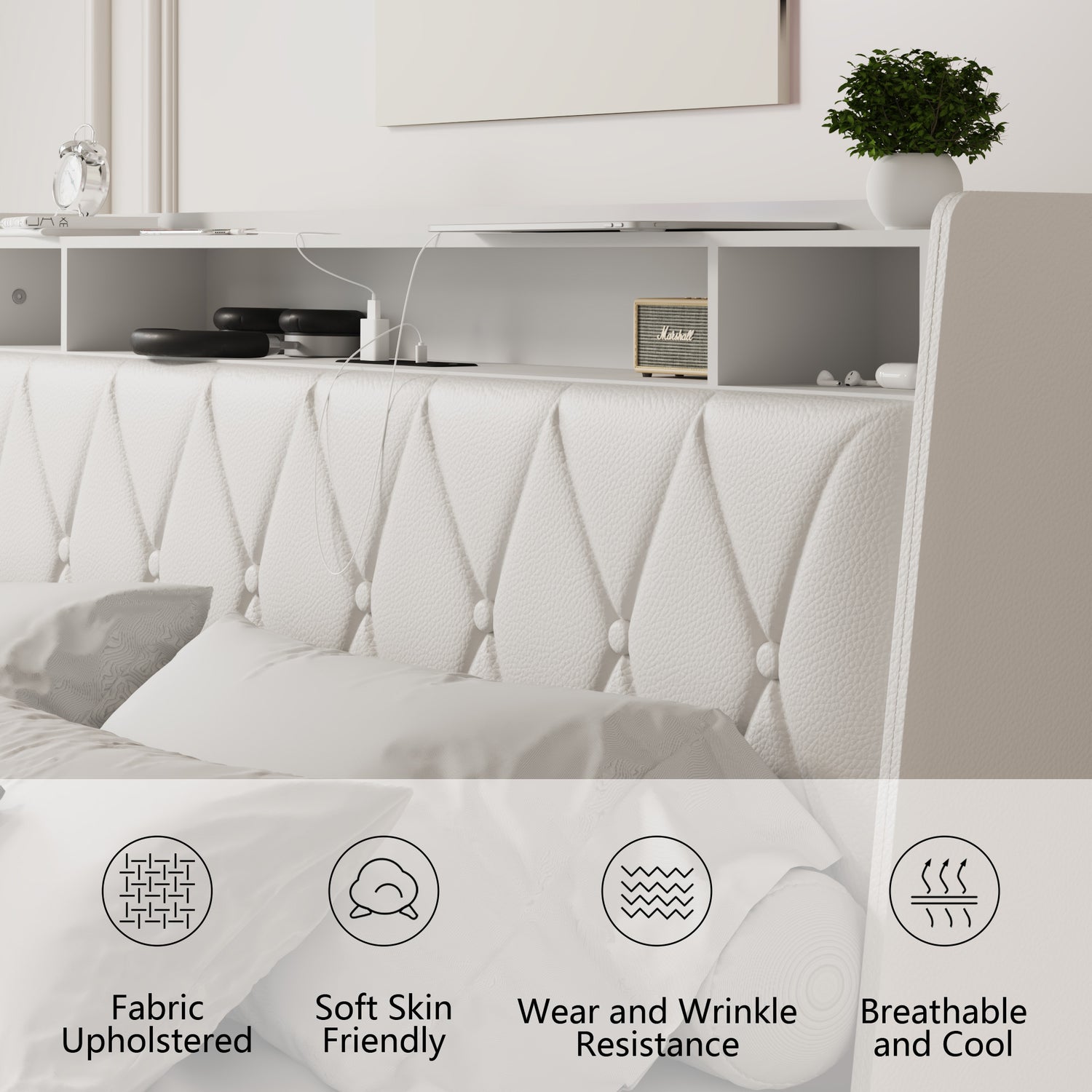 Full Bed Frame with Ergonomic Headboard, Metal & Wood Platform Bed with Charging Station and 4 Storage Drawers, Modern Full Size Upholstered Bed Frame, No Box Spring Needed, White
