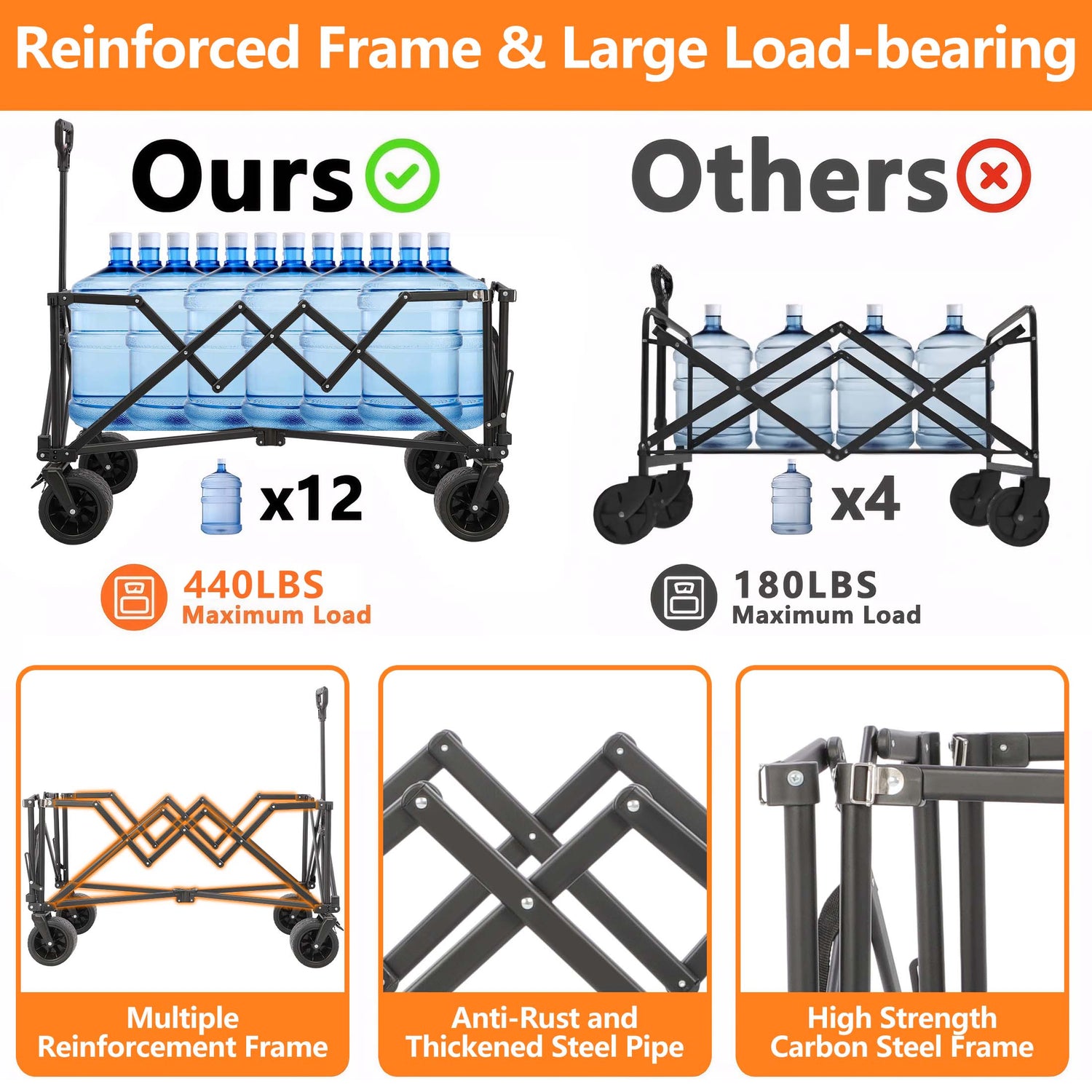 The wagon boasts a high-strength steel frame, upgraded full-welding technology, and a cross-chassis design, making it more stable and durable than most carts. It can support a substantial weight of up to 440 pounds.