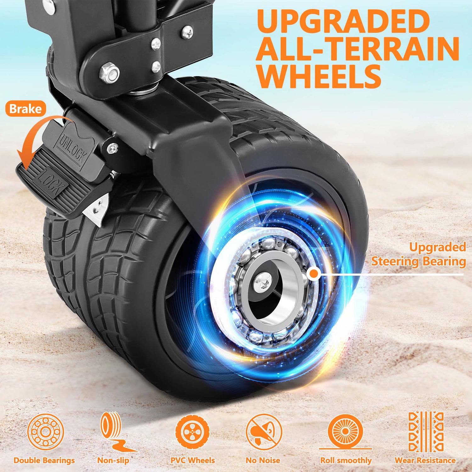 Equipped with 360° rotating large wheels, with brakes on the front wheels for better maneuverability and safety. The deep surface texture of the wheels provides excellent anti-skid performance, making it suitable for various terrains such as grass, sand, gravel roads, etc. This makes the cart more convenient to use at the beach and elsewhere.