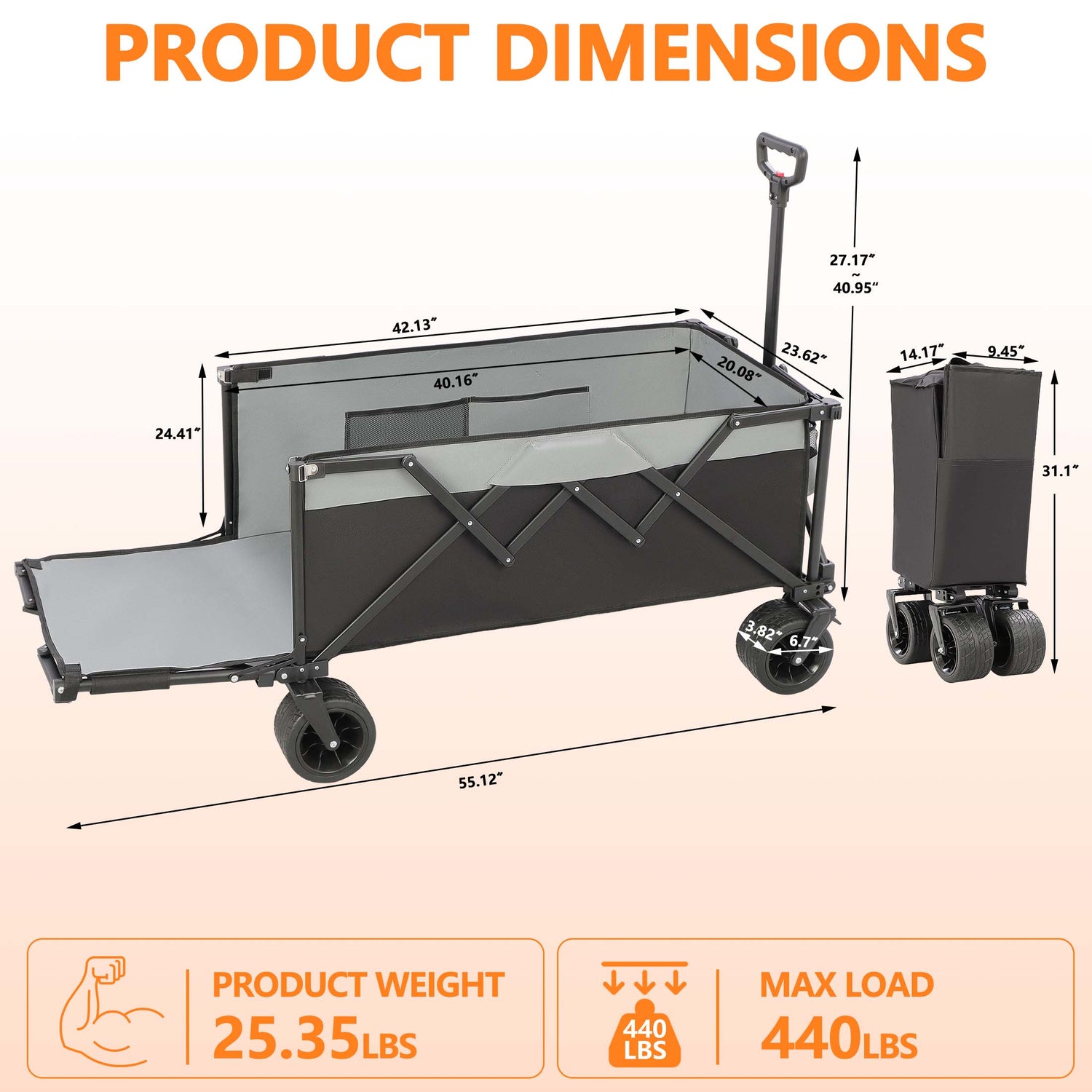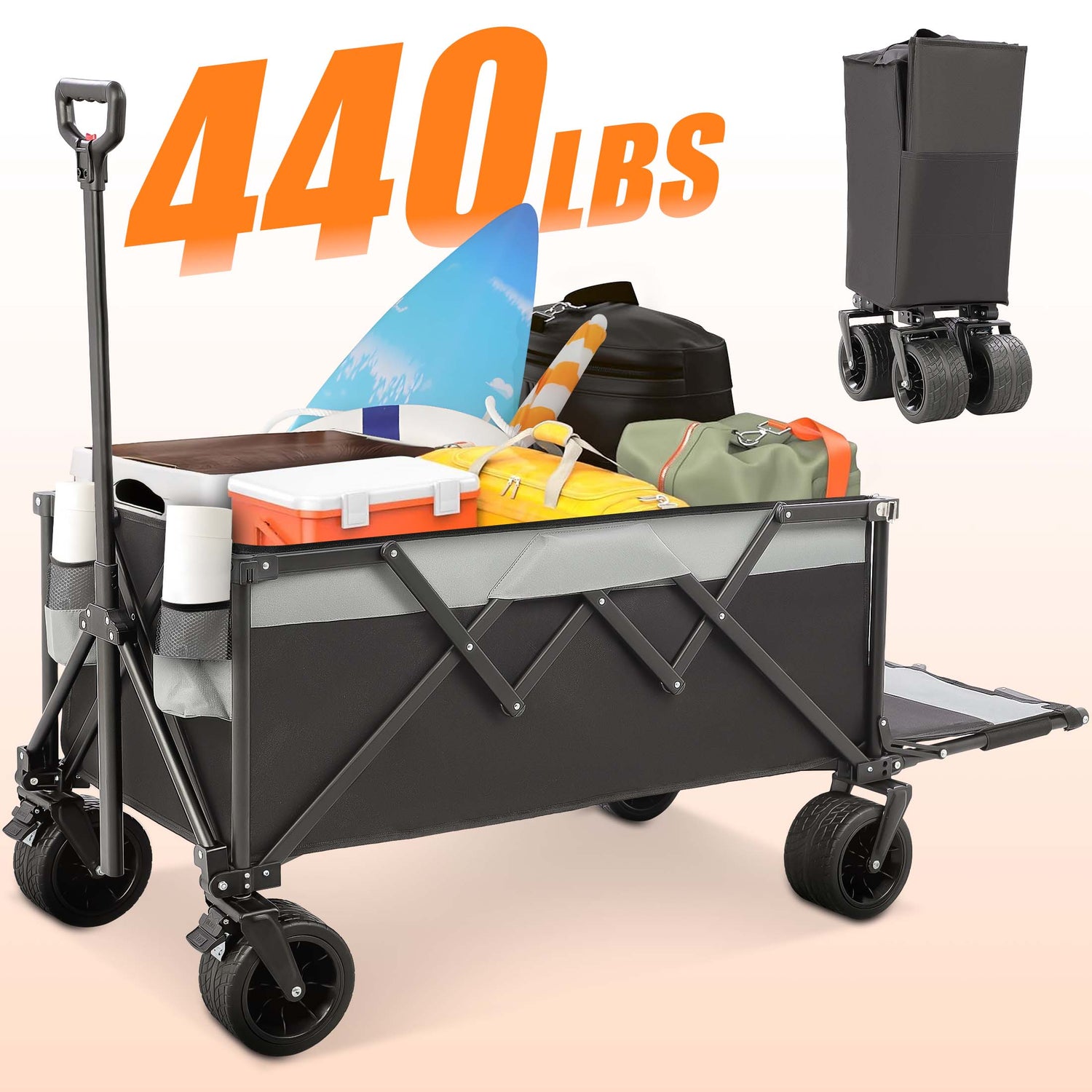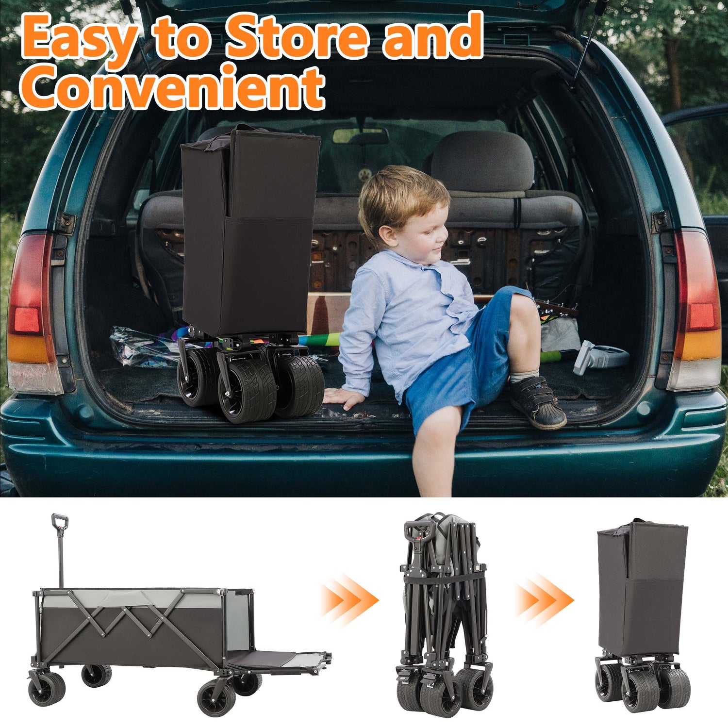 This folding wagon features the latest tailgate design, which can be opened to provide additional storage space. It’s roomy enough to accommodate various extra-long or oversized items, such as suitcases, tents, camping supplies, etc. It's also pet-friendly, making it easy for pets to get in and out.
