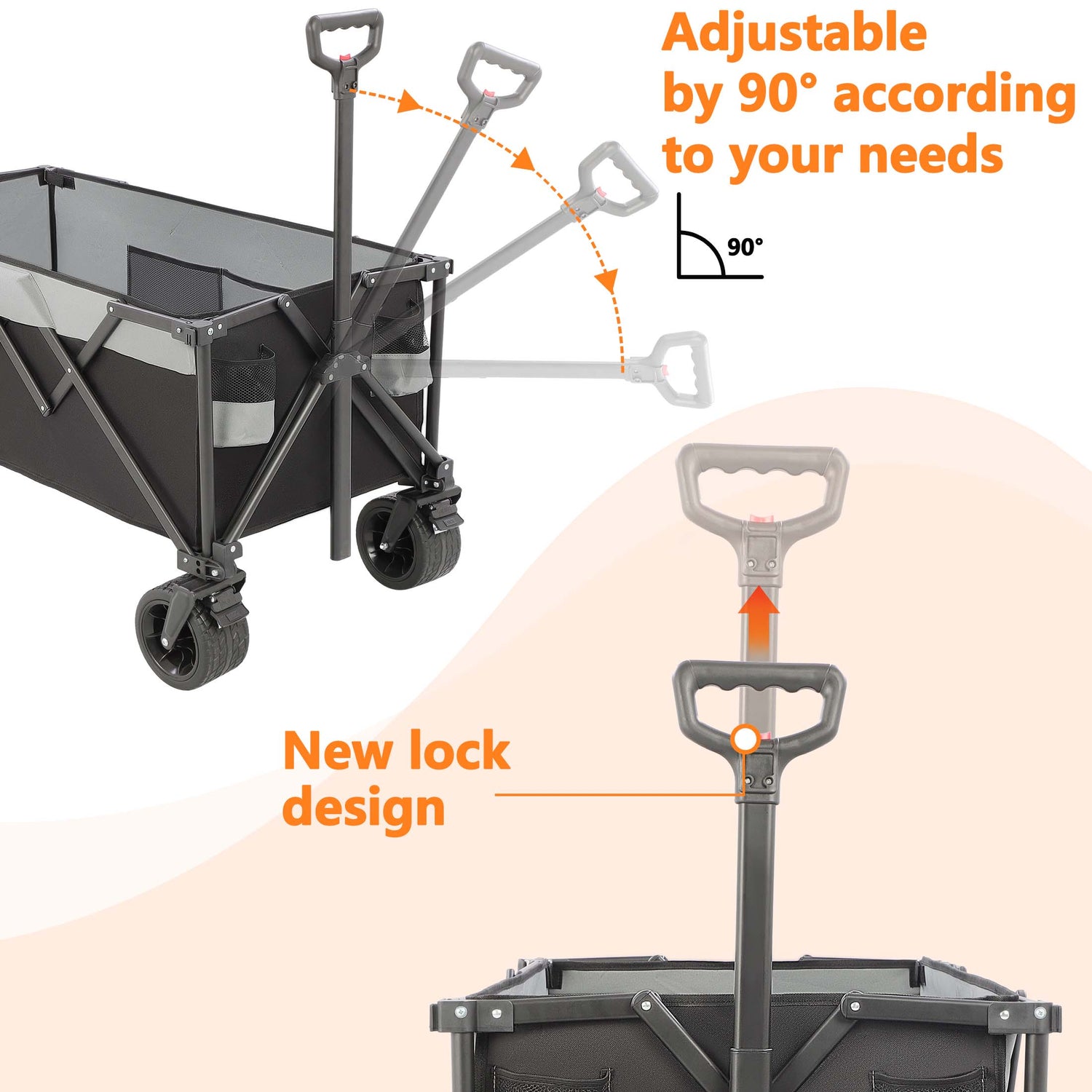 The handle is adjustable up to 90°, allowing you to use the wagon cart at the most suitable angle. Simply press the button on the handle to adjust and lock the height. Additionally, it comes with two cup holders so you can stay hydrated on the go.