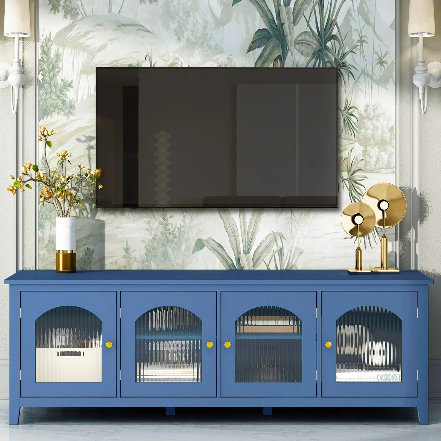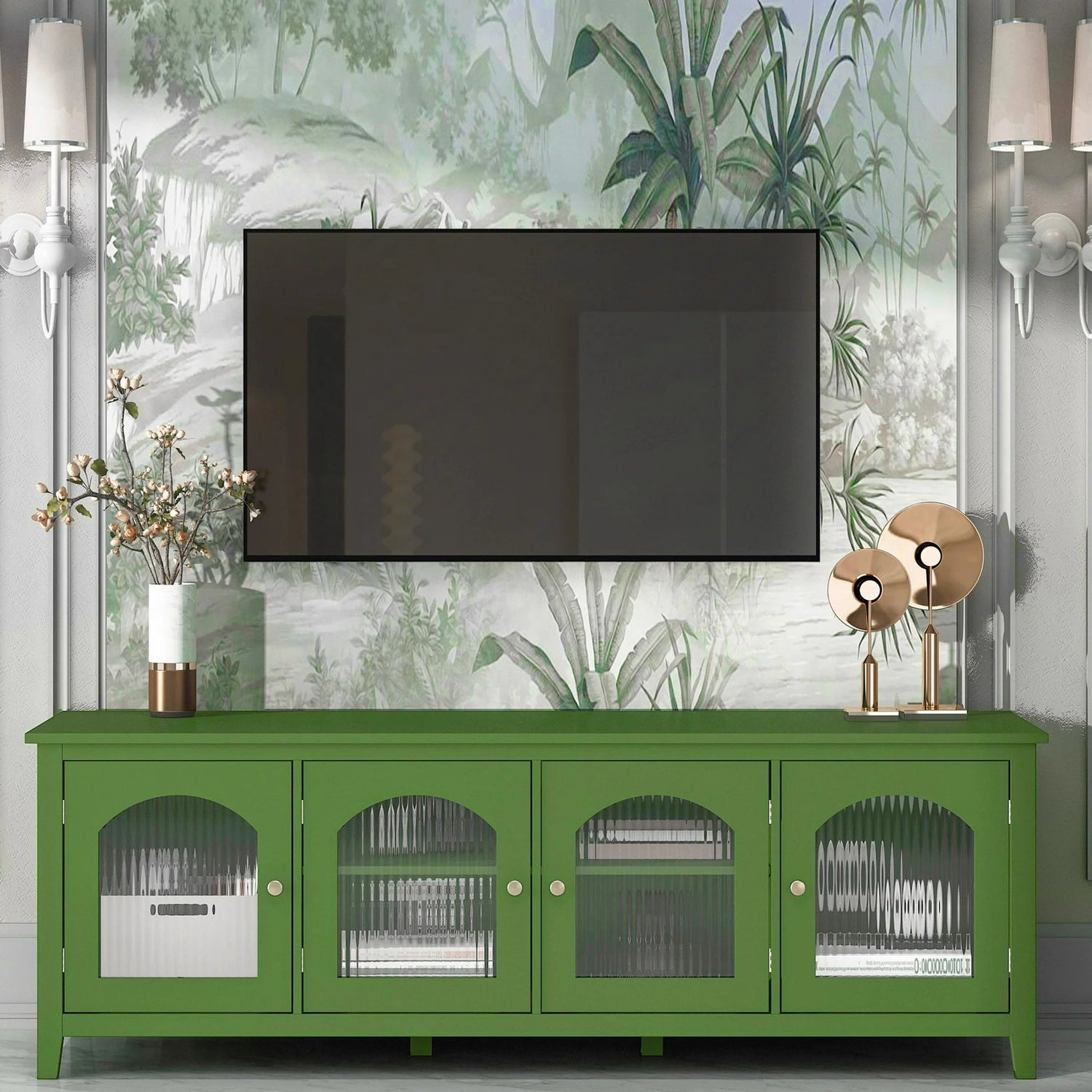 Transform your salon or bedroom into a modern and luxurious entertainment studio with our TV rack. Made of particle board, with ultimate quality hardware and glass doors, our home tv stand features storage shelves and two open cabinets for you to deposit multiple items like consoles or DVDs
