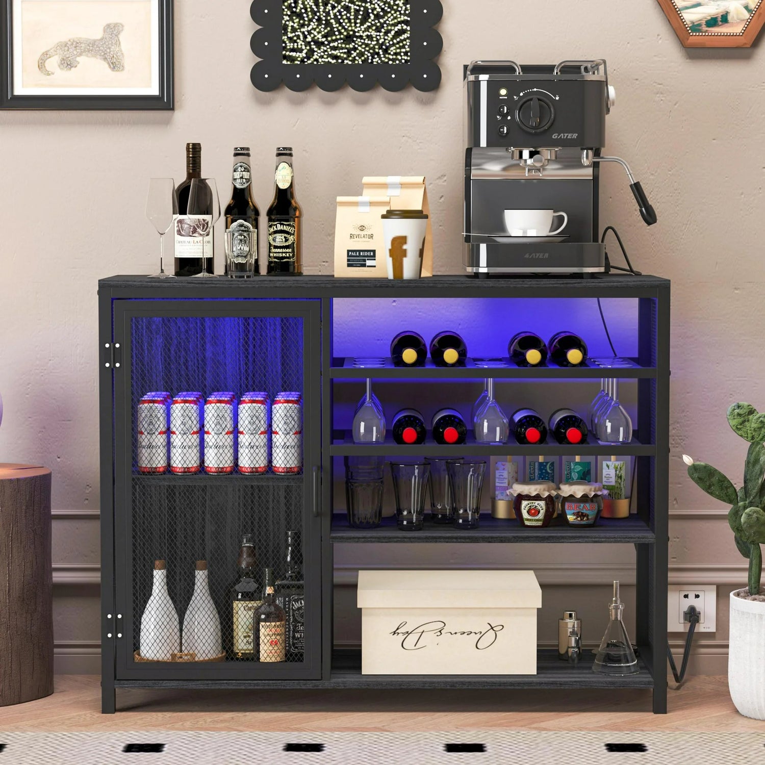 SESSLIFE Modern Bar Sideboard Buffet Storage Cabinet with 16 LED Lights and USB Socket, Black Wine Bar Cabinet for Kitchen, Dining Room and Living Room