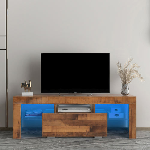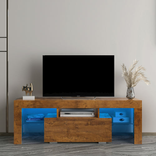 [LED TV STAND] - This home TV stand with LED has an amazing design, which is very suitable for family lovers. Equipped with glass shelves and 16 coloreds LED backlights, it is made of chipboard and provides enough storage space for the game console.