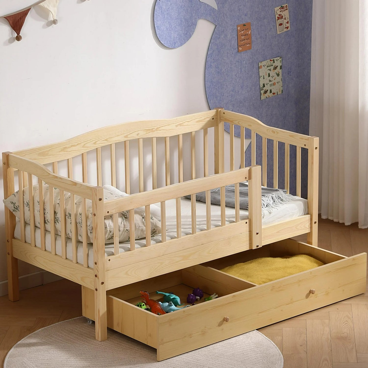 SESSLIFE Wood Toddler Day Bed with 2 Pull-Out Drawers, Kid Bed Frame with Fence Railings, No Box Spring Needed, Solid Wood Slats Supported Daybed for Toddler (White)